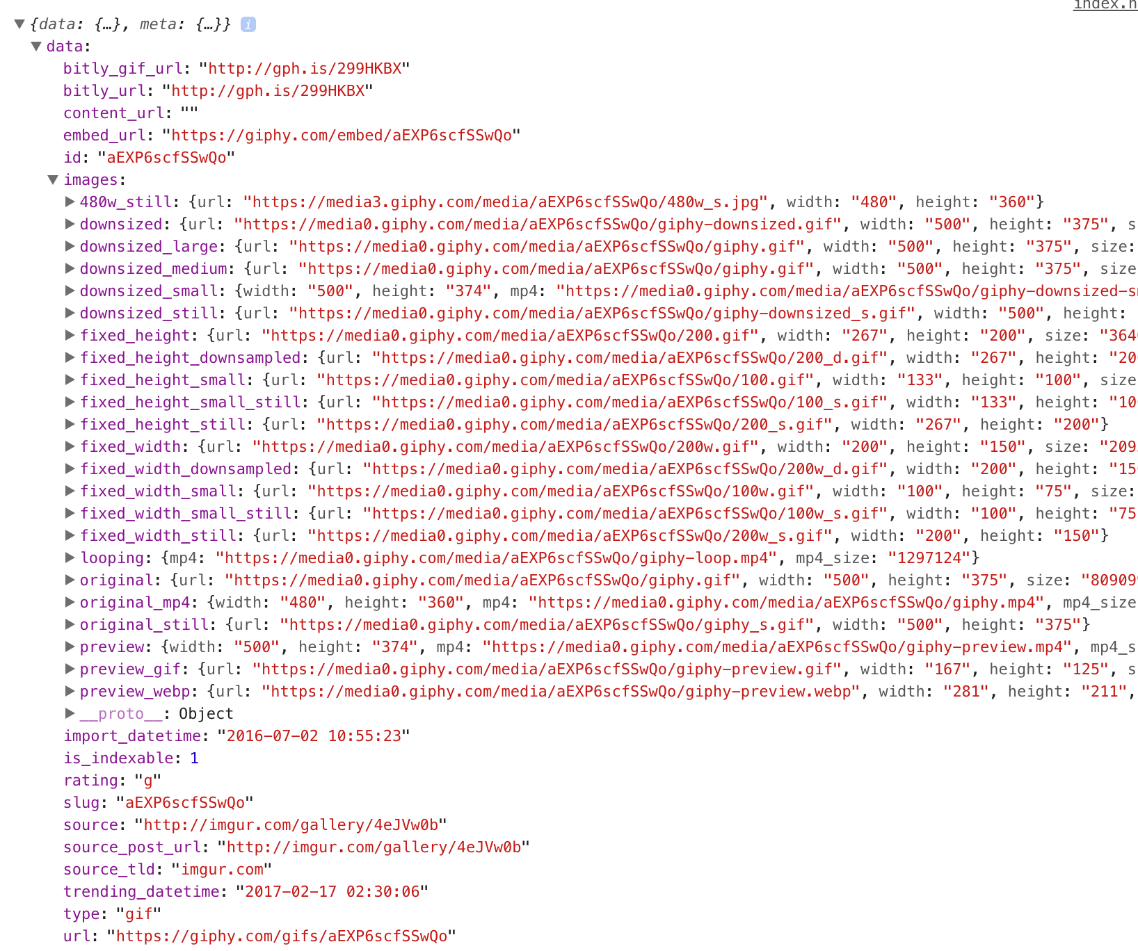Now we have a JavaScript object and if you inspect it closely enough you'll find that the data we need (an image URL) is nested rather deeply inside the object: